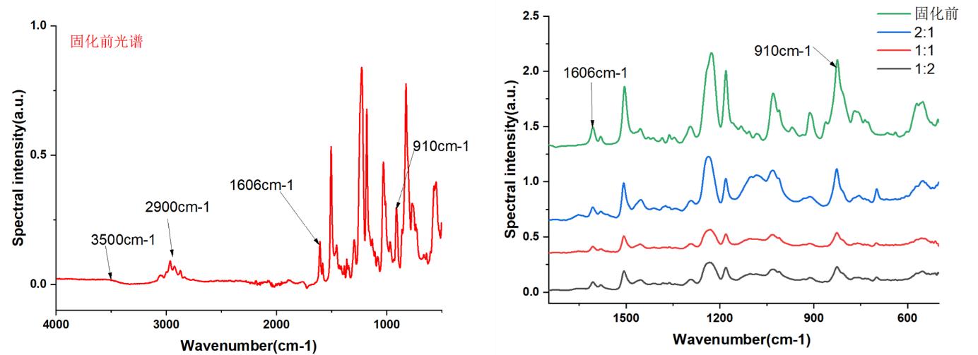 实验结果图4胺固化双酚A环氧树脂胶按2:1、1:1、1:2均匀混合并在室温固化4h后测定的光谱