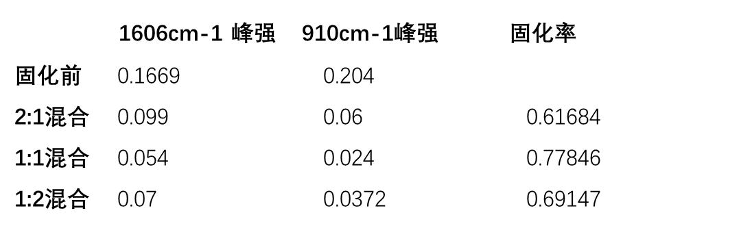 图4和表2是双酚A环氧树脂固化率测试的结果。实验中将双酚A环氧树脂胶和固化剂以不同的混合比例进行混合并室温固化4小时再测定红外光谱。从图4看到,固化前后主要特征峰保持不变,室温固化后,由于环氧键开环并形成羧酸阴离子和环氧基,氧基团对应的红外吸收峰位处910cm-1变弱, 峰位在1607cm-1的苯环的吸收峰不受影响且没有重叠,可以作为内标峰[3]。计算不同混合比例下的特征峰和内标峰的峰强和固化率的计算结果列于表2。结果发现,在混合1:1时,固化率更高,*高固化率达到77.8%,这可能和材料的质量相关。