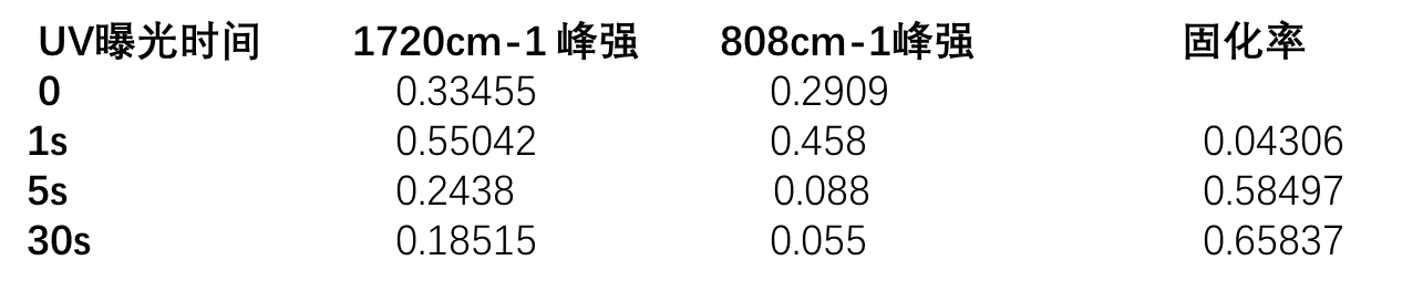 图5和表3是UV固化环氧丙烯酸酯的固化率测试结果,实验中将样品从黑色储存罐中取出后,涂覆在衬底上,以不同的曝光时间放置在紫外灯下固化后取出,并放置在ATR压头下红外光谱测试。UV胶在紫外光照射下,其中的C=C反应生成C-C。从图5可以看到主要特征峰位保持不变。C=C伸缩振动位于1696-1640cm-1之间,峰的范围较宽,容易和其他峰重叠,故不选。双键上的C-H伸缩振动位于3095-2995cm-1之间,容易和苯环C-H键重叠,也不选。而碳碳双键的C-H面外形变振动位于1010-667cm-1之间,UV胶常见于810±5cm-1位置,该区域峰相对单一且强度大,故选为特征峰。UV胶中C=O不参与反应且强度大,固选为内标峰进行计算[4]。从表3可以看出,UV胶在曝光5秒后固化率达到58.4%,而在曝光30s后固化率达到65%,基本形成固化。可见快速测量对UV固化胶很重要。