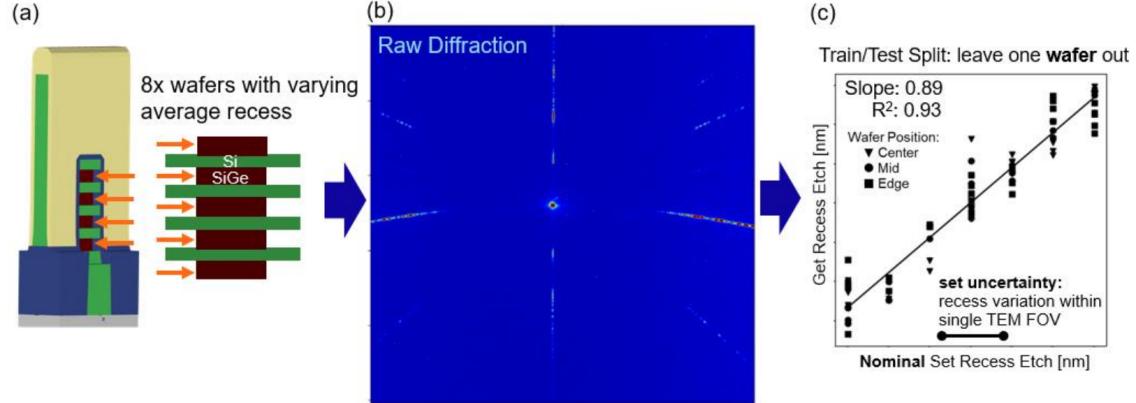 图3、晶圆GAA 3D结构散射测量。(a) 测量的英特尔GAA晶圆的示意图:8个晶圆的平均凹槽蚀刻因蚀刻时间而异。(b) 从 GAA 测量的衍射图案。 (c) 基于具有不同凹槽蚀刻时间的8个晶圆的数据驱动推理结果。