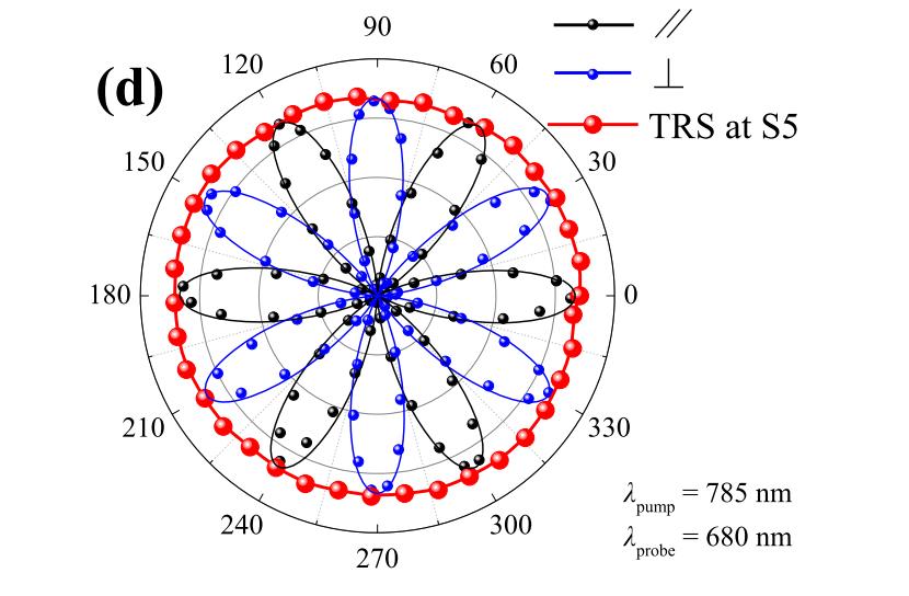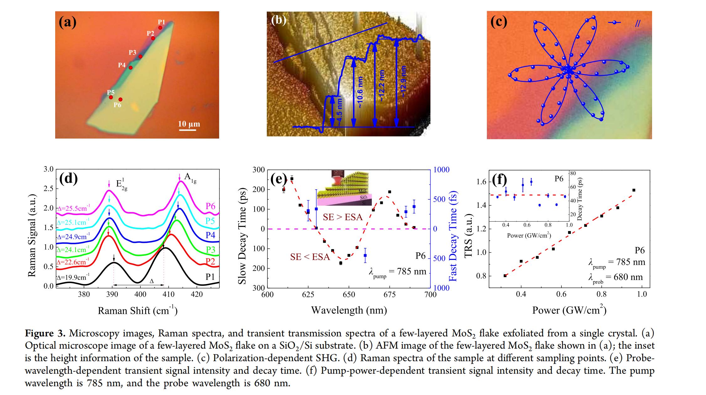 图2展示了激发偏振依赖的TRS和SHG。SHG数据显示出标准的6重对称性图案,而TRS强度随着泵浦偏振的变化并没有明显变化,这进一步排除了在我们的实验条件下MoS?片中由二阶或三阶光学非线性引起的TRS。