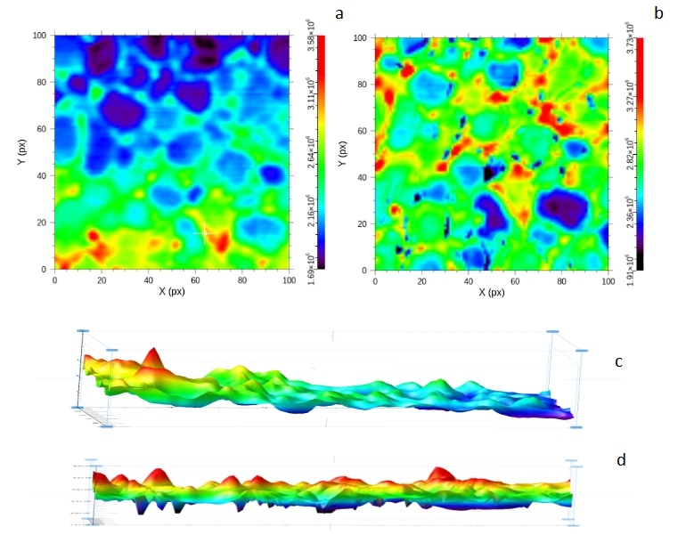 图 先进陶瓷材料,a(非自动聚焦)b(自动聚焦)的拉曼成像平面图;c(非自动聚焦)d(自动聚焦)的拉曼成像剖面图