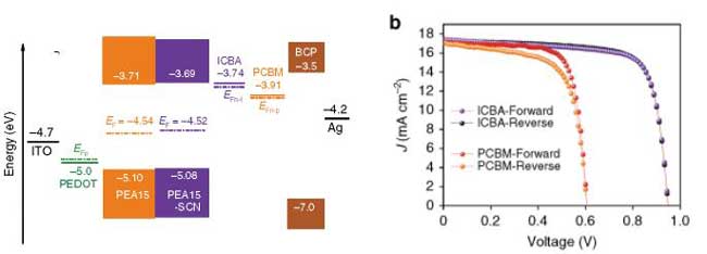 在本文工作中,作者提出了全新的研究思路,从器件结构的角度出发,在低维锡基钙钛矿结构和反式太阳能电池结构基础上,设计利用较浅LUMO轨道能级的富勒烯衍生物ICBA作为电子传输层材料,取代常用的富勒烯衍射物PCBM,提高了光照条件下的准费米能级位置,实现了锡钙钛矿和电子传输层之间的能级匹配。同时ICBA抑制了碘离子长程掺杂带来的电子传输层载流子浓度提高,降低了界面的载流子复合,实现了0.94 V的开路电压和12.4%能量转换效率(图1)。通过课题组的工作表明,锡钙钛矿的P型掺杂所带来的界面复合是影响器件开路电压的重要因素,因此,可以通过合理的界面设计,提高锡钙钛矿太阳能电池性能。