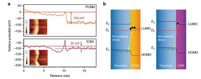 图2 (a)锡钙钛矿与电子传输层之间的界面电势SKPM扫描图;(b)锡钙钛矿和电子传输层之间的界面非辐射复合示意图。