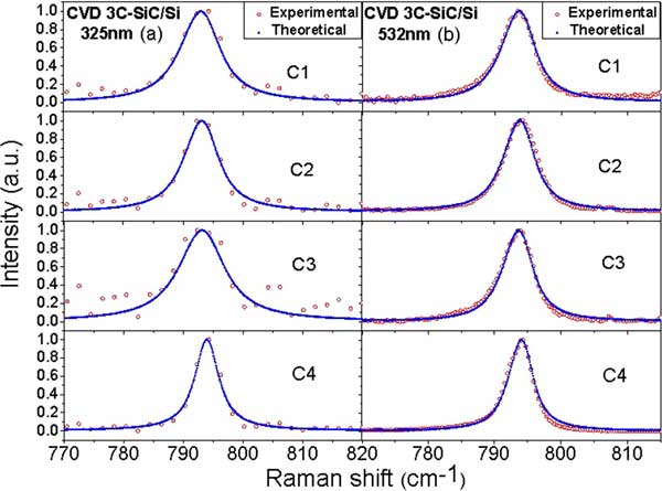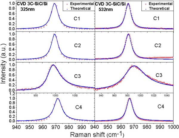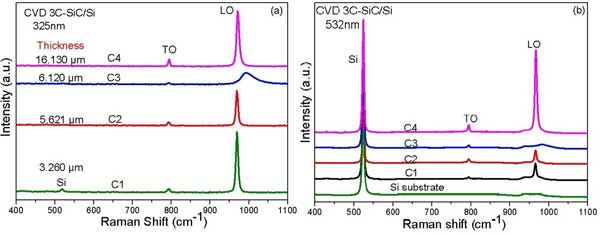 广西大学冯哲川教授课 题组采用化学气相沉积法在硅衬底上生长一系列不同厚度的3C-SiC薄膜。采用不同的激发源做拉曼光谱研究,并应用空间相关模型、本振声子和等离子体耦合(LOPC)模型来分析薄膜的结构变化,得到不同深度薄膜光学模式的特征变化。