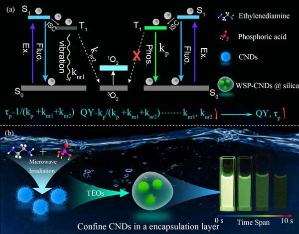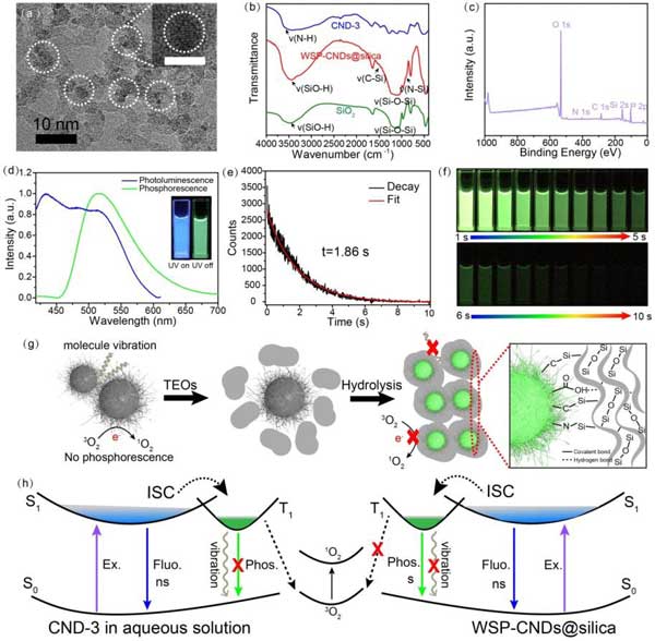 图3: CDs@Silica复合材料的结构和光学性能以及其在水溶液中磷光发射原理。