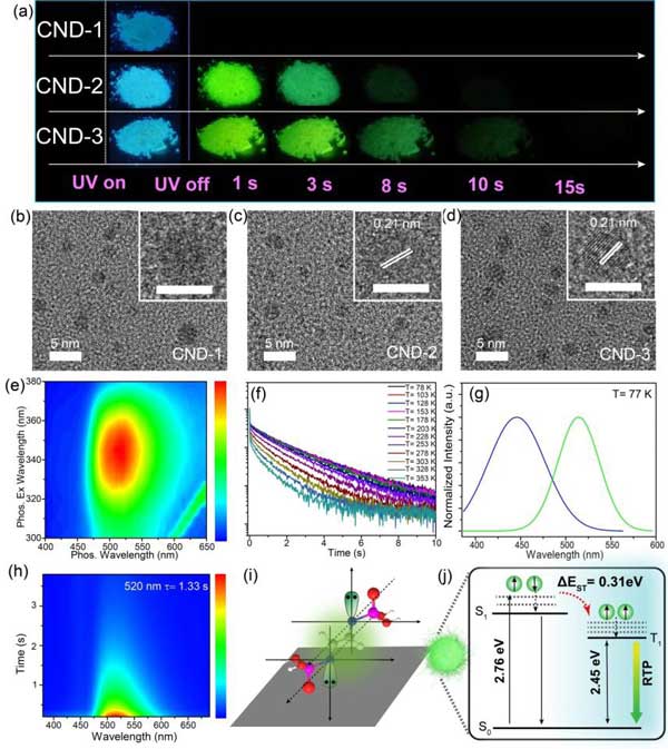 图2: CDs的结构和光学性能以及磷光发光机理。