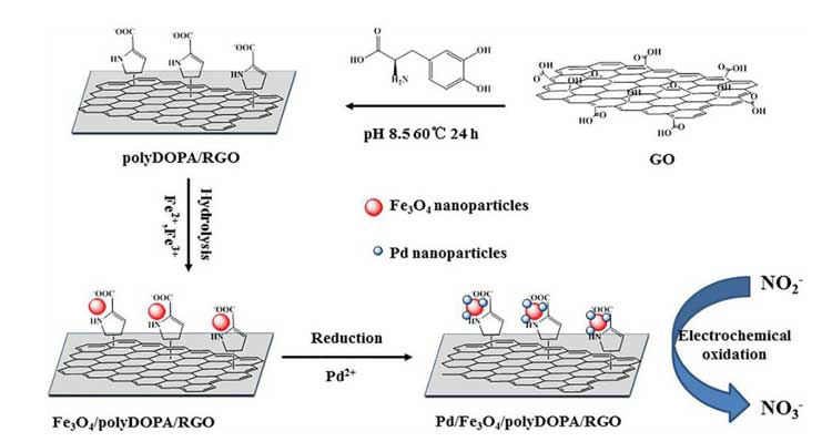如今,化学还原法是制备石墨烯基纳米复合材料的常见方法。但是,用于化学还原氧化石墨烯(GO)和金属离子的还原剂如肼与NaBH4为有毒害物质,也存在一定的安全隐患。多功能生物聚合物聚多巴胺(PDA)可以通过多巴胺(DA)的自聚合形成表面粘附涂层来修饰各种基材。 PDA涂层可以用作通用平台,不仅可以改善RGO的亲水性并防止RGO团聚,还可以在RGO表面上原位成核和生长金属、金属氧化物和半导体等。兰州大学叶为春课题组基于polyDOPA(3,4-Dihydroxy-l-phenylalanine,DOPA)平台原位成核和生长Fe3O4和Pd纳米粒子。该方法没有引入还原剂或者结构导向剂,合成的Pd / Fe3O4 / polyDOPA / RGO复合材料作为亚硝酸盐电化学传感器,表现出良好的电催化活性。结果表明,这种电化学传感器检出限低、选择性好、线性范围宽,可以成功应用在河水、香肠制品及白菜腐烂过程中亚硝盐浓度检测,在日常检测中具有广阔的应用前景。