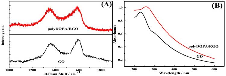 图1: GO和polyDOPA/RGO的拉曼和紫外光谱
