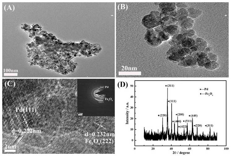 图2:Pd/Fe3O4/polyDOPA/RGO: TEM, HRTEM及XRD图