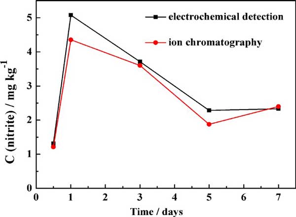 将大白菜在30℃下密封以迅速腐烂,在图3中可以清楚地看到,亚硝酸盐含量在开始阶段迅速增加,并在24小时内达到最大值(5.08 mg / kg),这是由于硝酸盐还原为亚硝酸盐所致。然后,它在2天后积累到很高的水平。 随后,随着时间的流逝,亚硝酸盐的含量逐渐降低。 亚硝酸盐含量变化的趋势与常规离子色谱法测定的结果相符(图3)。重要的是,该传感器和离子色谱法测试结果相对偏差值在10%以内,是可以接受的。这些结果表明,该电化学传感器对于真实样品中的亚硝酸盐检测是可靠且高效的。