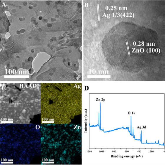 图1:Ag纳米片表面负载ZnO纳米粒子的表征。
