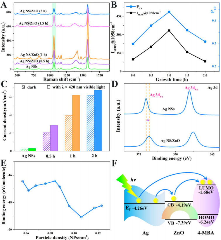 该研究在课题组合成大尺寸Ag纳米片的基础上,采用化学修饰方法在Ag纳米片上生长ZnO纳米粒子,对其结构、组成和形貌进行表征。通过对ZnO纳米粒子负载量的优化实验发现,只有合适的ZnO负载量(17.5 wt%)才有SERS性能,且具有高SERS检测稳定性和均一性(图1)。基底在空气氛围环境中放置30天,其SERS强度仍保持初始强度的93%,优于纯Ag纳米片的81%。如果在Ag纳米片表面修饰非半导体氧化物(SiO2)时,其SERS信号强度随SiO2负载量单调性下降,这充分说明Ag与ZnO间CT协同机制的存在。除一系列实验(XPS,光电流测试和CT增强程度PCT的计算等)分析外,还应用分子动力学模拟(MD)计算分析了作用在该基底上的探针分子键能变化,发现当ZnO 修饰密度为0.106 NPs /nm2时基底与探针分子的键能大(-19.1 eV),为分析Ag与ZnO间的CT增强机制提供理论依据 (图2)。