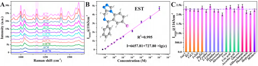 图3:SERS检测单一药物EST含量的线性图及其抗干扰性。