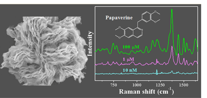 当一些分子被吸附到某些粗糙的金属表面上时,他们的拉曼散射强度会极大的增强,后来科学界把这一现象命名为表面增强拉曼散射效应(Surface-enchanced Raman Spectroscopy, SERS),简称SERS。常用的基底有贵金属(Cu,Ag,Au 等)粗糙电极、贵金属溶胶、纳米颗粒、纳米阵列等,基底也赋予了SERS具备更高的高灵敏度,故广泛应用于生物制药、食品安全、刑侦安检等领域。该技术可以获得痕量分子结构信号,特别适合于对微量物质的研究分析。但其基底重现性和稳定性难以控制,这一定程度上限制了其推广和应用。因此,研究和开发优良的基底成为SERS研究的重点和热点。