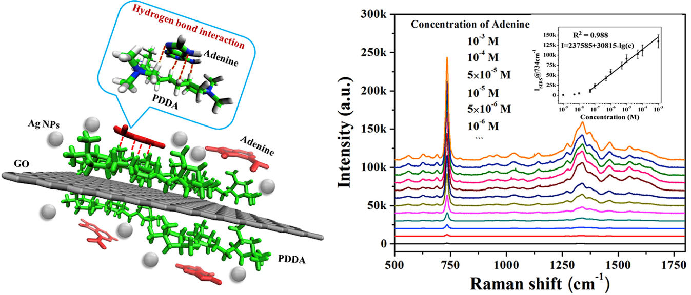 3、利用氢键在样品富集和选择性检测中具有独特的优势,采用自组装法制备氧化石墨烯/聚二烯丙基二甲基氯化铵/银纳米粒子(GO/PDDA/Ag NPs)纳米复合材料作为SERS基底,具备良好的稳定性和SERS检测的可转移性;实现定量检测水溶液中腺嘌呤含量,并对其他结构相似的核酸碱基如鸟嘌呤、胞嘧啶、胸腺嘧啶具有良好的抗干扰能力。应用DFT计算分析了PDDA与腺嘌呤间氢键作用的不同结合方式及其键能大小,为氢键的选择性富集作用提供支撑。该研究工作发表于Talanta 2019, 204, 372-378。