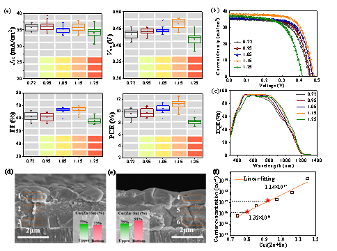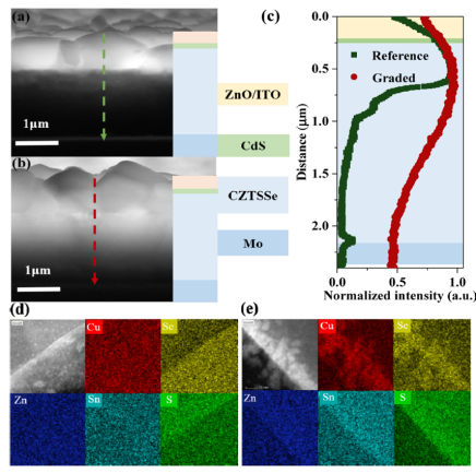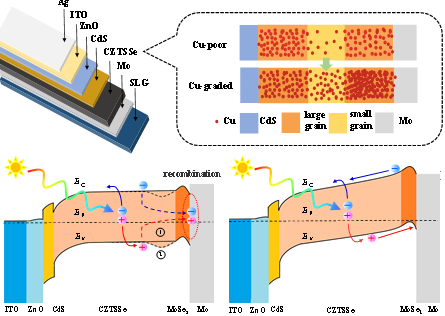 河南大学武四新教授课题组基于贫铜组分在前界面以及富铜组分在背界面的优势,设计了一种三层(大晶粒/小晶粒/大晶粒)的铜梯度吸收层结构,底部铜含量较高而表面铜含量较低。较高的铜浓度可以增加载流子浓度,通过构筑载流子浓度梯度改善电荷传输驱动力。同时,高铜组分可以使吸收层价带上移,降低空穴的注入势垒,从而降低背界面复合。顶部的贫铜结构减缓了表面的费米能级钉扎并有利于界面能带弯曲的保持。铜梯度吸收层优良的电学性能使器件效率达到12.54%,对于后续铜锌锡硫硒薄膜太阳能电池的界面性能改善及吸收层结构优化具有重要的意义。