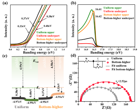 图4 吸收层前表面和背表面的UPS光谱、能带排列和EIS奈奎斯特图