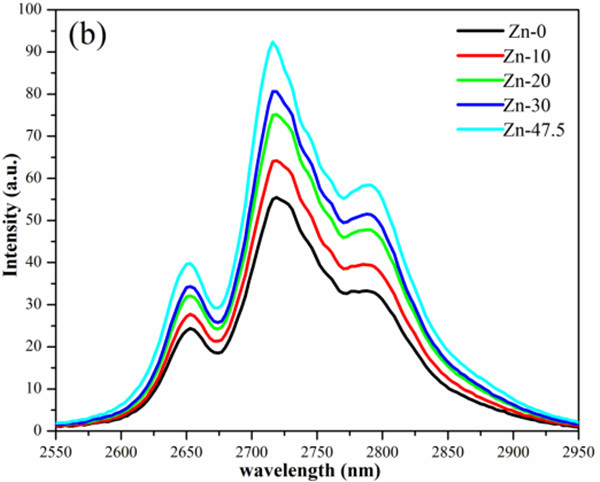 根据表1的结果显示,随着ZnF2逐渐取代PbF2,玻璃中的羟基吸收系数逐渐减弱、羟基浓度逐渐减小,说明利用ZnF2取代PbF2制备出来的玻璃具有更低的羟基浓度,而羟基又是玻璃红外发光的淬灭中心,所以玻璃的发光强度随着玻璃中的羟基含量降低而增强。