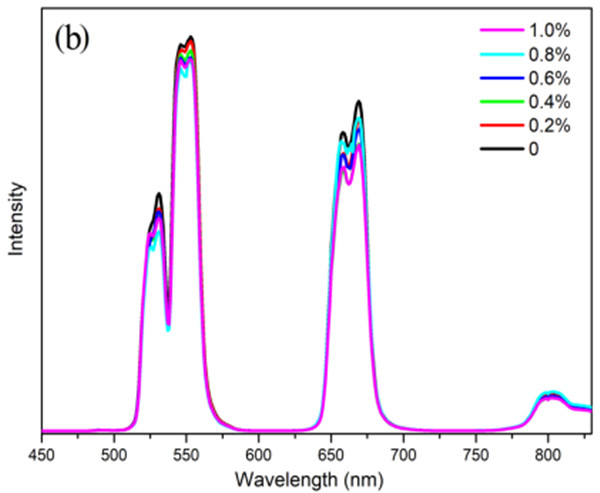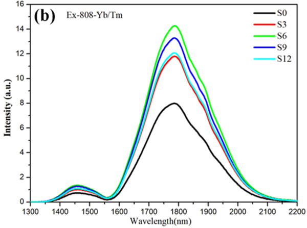 (b)样品在不同硫酸根用量时650℃热处理3h后在808nm激光激发下的近中红外发光,