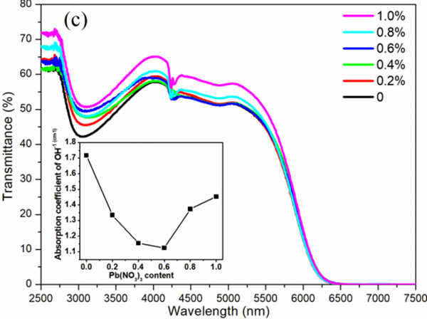 图2 玻璃基质成分为67.5TeO2-10PbF2-(10-x)PbO-5YF3-1ErF3-1.5YbF3- xPb(NO3)2 (x=0, 0.2, 0.4, 0.6, 0.8, 1.0)的(a)近中红外发光,(b)上转换发光,(c)红外透射光谱。由图可见,加入微量的化学澄清剂硝酸根离子,可以让玻璃的近中红外发光大幅度的增强,而上转换发光强度基本上没有变化。由于玻璃基质成分并没有变化,发光增强可以认为是由玻璃中的羟基含量减少造成的,而硝酸根离子在高温分解释放出的气体造成玻璃中羟基含量的减少。