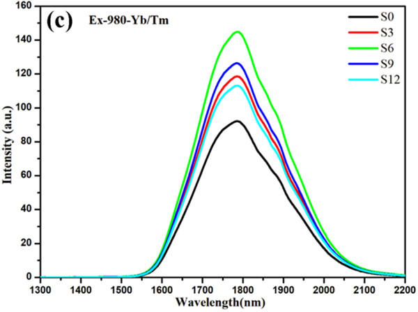 (c)样品在不同硫酸根用量时650℃热处理3h后在980nm激光激发下的近中红外发光,