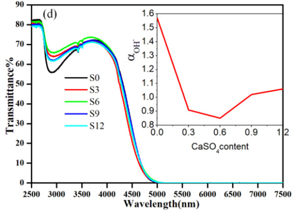 由图可见,加入微量的化学澄清剂硫酸根离子,可以让玻璃的近中红外发光大幅度的增强。由于玻璃基质成分并没有变化,发光增强可以认为是由玻璃中的羟基含量减少造成的,而羟基含量减少是由于硫酸根离子在高温分解释放出的气体造成玻璃中的羟基含量大幅度降低。