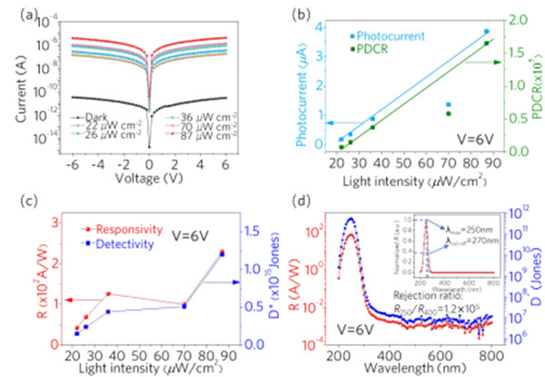 图2.(a)在不同条件下半对数坐标中器件的I-V特性。(b)光电流和PDCR,(c)R和D*对光强的依赖关系。(d)MSM ε-Ga2O3 SBPD的R和D*随波长的变化曲线。插图为器件的归一化光谱响应曲线。
