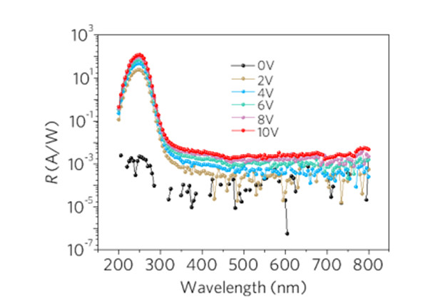 图3.不同偏压下,半对数坐标中MSM ε-Ga2O3 SBPD的光谱响应曲线。