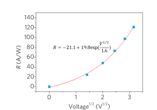 图4. 响应光谱的峰值响应度作为V1/2的函数曲线。