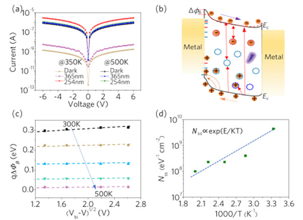 图5.(a)在不同条件下器件的I-V曲线。(b)MSM ε-Ga2O3 SBPD的能带示意图。(c)不同温度下势垒高度作为(Vbi-V)的函数。(d)被占据的缺陷态密度的Arrhenius图。