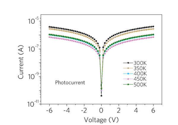 图6. MSM ε-Ga2O3 SBPD的I-V曲线对温度的依赖关系。