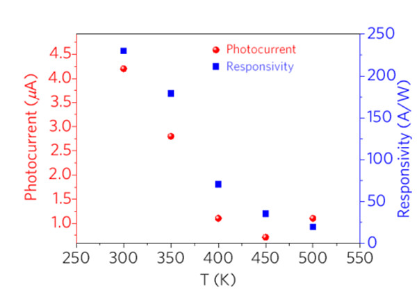 图7.光电流和响应度随温度的变化曲线。