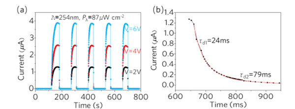 图8(a)显示了不同偏置电压下光电特性随时间的变化,器件对波长254nm的光照具有良好响应、再现性和稳定性,在重复开关光源时器件衰减速度很快。为了获得更准确的恢复时间,将该瞬时响应的衰减阶段放大后绘制在图8(b)中。MSM ε-Ga2O3 SBPD器件的衰减时间τd1和τd2分别为24和79 ms。这两个值与之前报道的Ga2O3光电探测器相比有明显提高。