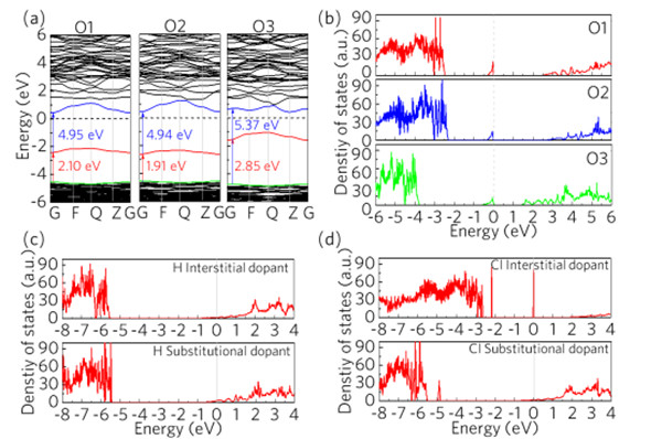 图9.(a)ε-Ga2O3中三种不等价氧的能带结构图。蓝色和红色的值分别表示禁带宽度和价带顶上部的氧空位引入的缺陷能级。(b)三种不等价氧,(c)间隙/替位杂质H和(d)间隙/替位杂质Cl 引入的缺陷能级态密度。