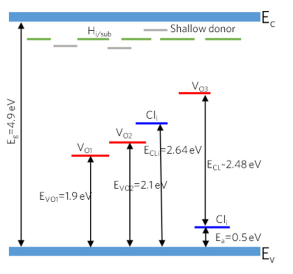 此外,本文研究了氢和氯掺杂有关的缺陷态,在图9(c)中可以观察到,深能级缺陷状态可以被氢钝化,得到Ga2O3中的一个浅层施主。MSM ε-Ga2O3 SBPD快速的响应速度归功于这些缺陷能级的钝化。同样地,如图9(d)所示,Cl作为间隙杂质时,将在ε-Ga2O3的带隙中引入位于VBM上方的两个缺陷能级。当Cl作为替位杂质,缺陷移动到导带底(CBM),但在价带顶(VBM)附近仍然存在深能级缺陷态。图11给出了ε-Ga2O3能带图。