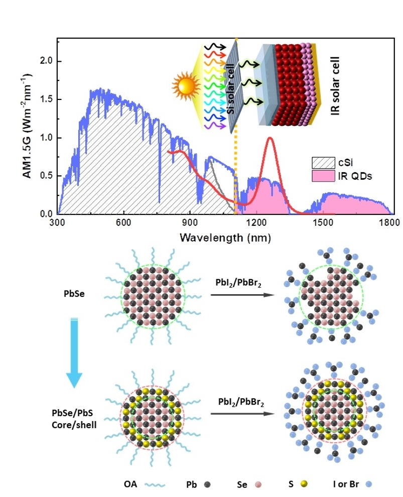 PbSe QDs是解决目前红外太阳能电池低JSC的关键。然而,目前还未见关于窄带隙PbSe QDs(<1.1 eV)红外太阳能电池的报道,这可能是由于大尺寸PbSe QDs表面暴露更多高活性的富Se的(100)晶面,导致其表面钝化工程异常困难。较差的表面钝化会产生较高的开路电压(VOC)损失,这也可能是目前宽带隙PbSe QDs(~1.3 eV)电池性能较差的原因。基于以上问题,该课题组将阳离子交换与原位卤素钝化相结合,在PbSe QDs表面外延生长PbS薄壳,获得了兼具高电子耦合和优异表面钝化的PbSe/PbS核壳量子点,并实现了高效红外太阳能电池。带隙位于~0.95 eV的PbSe/PbS核壳量子点红外太阳能电池在Si过滤后获得了更高的VOC (0.347 V),是PbSe QDs器件的1.46倍。此外,由于PbSe QDs核的强电学耦合特性确保了有效的载流子输运,PbSe/PbS QDs器件比目前报道的PbS QDs器件表现出更高的红外JSC (6.38 mA cm-2)。