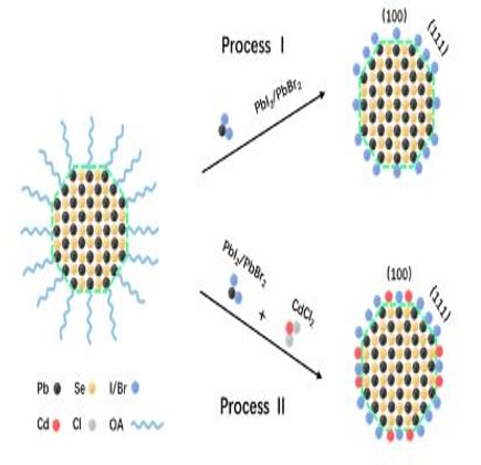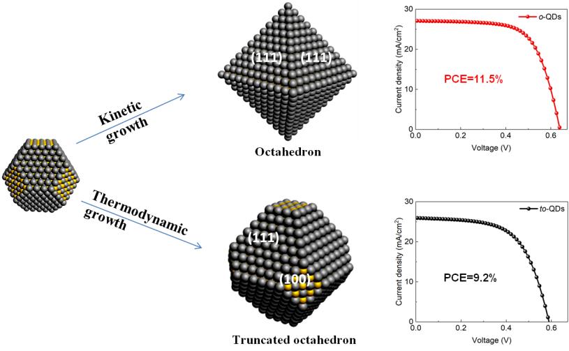 最多的材料是硫化铅(PbS)胶体量子点,其认证的效率已达到12.5%。缺陷控制是量子点太阳能电池性能提升的关键,并且近期的研究表明PbS量子点表面的{100}面是缺陷的主要来源。当前,大部分的研究也集中于PbS量子点的表面钝化和发展新的配体交换方案,以达到消除缺陷的目的,好比是“治疗先天缺陷”。华中科技大学的张建兵团队和合作者则换一种思路,期望在量子点的合成过程中就抑制{100}面,从源头上规避缺陷,直接获得“身体健康”的PbS量子点。他们基于阳离子交换合成方法,通过控制量子点生长过程中的动力学和热力学平衡来实现晶面的有效调控。研究表明,在动力学占主导的生长条件下,量子点各向异性生长,获得的约3 nm PbS 量子点的几何结构近似为八面体,表面几乎仅含{111}晶面;而在热力学占主导的生长条件下,量子点各向同性生长,获得的量子点几何结构为截角八面体,表面具有{111}和{100}晶面。因此,基于表面近乎只含{111}晶面的量子点光伏器件效率高达11.5%,相比表面同时含有{111}和{100}晶面的量子点器件效率提升了25%。这项工作将PbS量子点的合成推进到新的高度,不再停留在尺寸控制、尺寸均一性和表面钝化上,通过晶面控制,从源头上规避了缺陷,为量子点光电器件的性能优化提供了新思路。(Adv. Funct. Mater,2020,30,2000594)