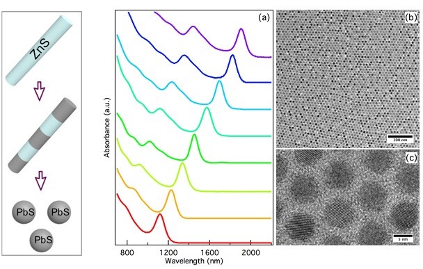 当尺寸增加(带隙减小)时,PbS量子点对空气的敏感性显著增加,容易引入新的缺陷态。因此,研究者们通常采用阳离子交换方法来合成具有原位卤素离子钝化的PbS量子点。但是,这种方法合成出的PbS量子点尺寸分布不佳(尤其大尺寸),影响载流子的迁移。为了解决这一问题,张建兵副教授团队首次采用ZnS纳米棒到PbS量子点的阳离子交换方案,其基本思想是依靠由棒到点转变过程中因部分溶解而释放的S来维持一定的过饱和度,促进量子点的生长并且维持较好的尺寸分布。系统改变合成参数,在尺寸分布的均匀性、尺寸可控性、重复性以及宏量制备等方面对阳离子交换合成进行优化。通过捕获反应和生长的中间态,研究了从棒到点的形貌转变过程和机理以及量子点的生长控制机制。这种从棒到点的阳离子交换合成出的PbS量子点除了具有极好的尺寸分布外,表面还具有卤素Cl-离子钝化,实现了较好的表面缺陷态控制。基于这种方案合成的高质量大尺寸窄带隙PbS量子点,我们