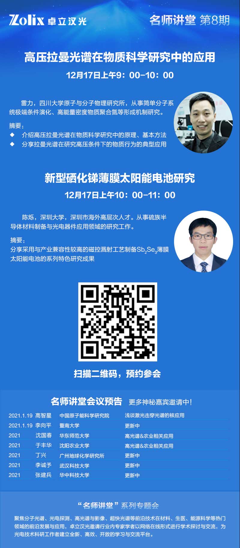 阐述热门应用,了解新型材料,本次报告将分为两个章节涉及高压拉曼光谱、新型硒化锑薄膜太阳能电池测试两大细分领域。学科有边界,知识无边界,即刻报名,与光电名师面对面交流!