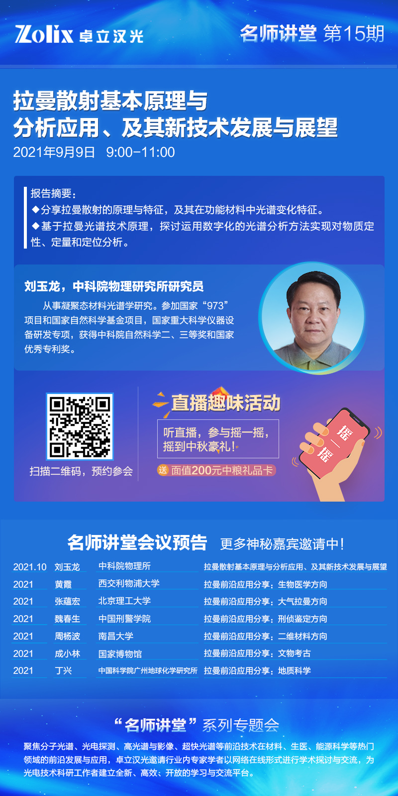 为推动拉曼光谱分析与检测技术事业快速发展,促进我国拉曼光谱技术进一步,北京快盈lV仪器有限公司秉持为科研工作者提供良好的学术交流平台的服务理念,将于2021年9月至2021年1月以网络在线的形式每月定期召开拉曼专题直播会。