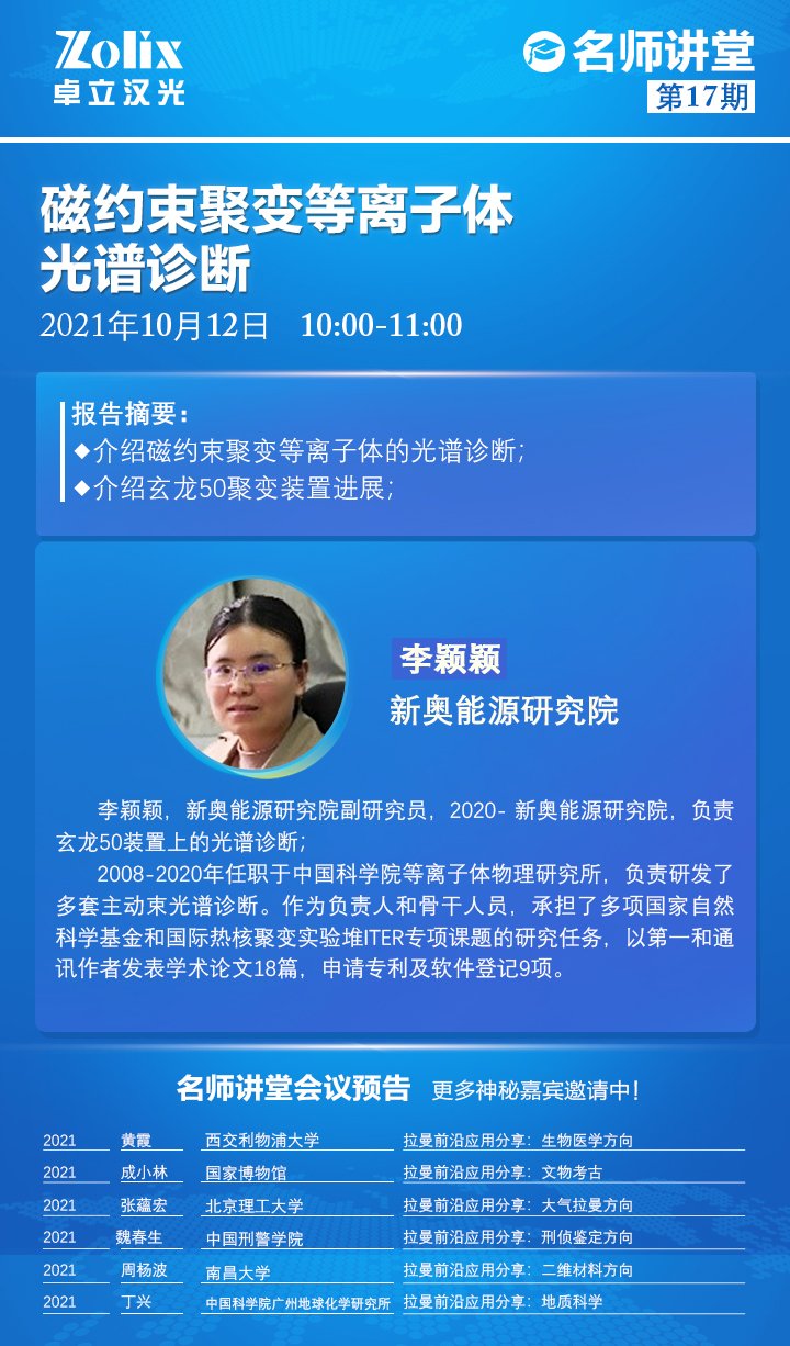 报告题目:磁约束聚变等离子体光谱诊断聚焦分子光谱、光电探测、高光谱与影像、超快光谱等前沿技术在材料、生医、能源科学等热门领域的前沿发展与应用,快盈lV邀请行业内专家学者以网络在线形式进行学术探讨与交流,为光电技术科研工作者建立全新、高效、开放的学习与交流平台。