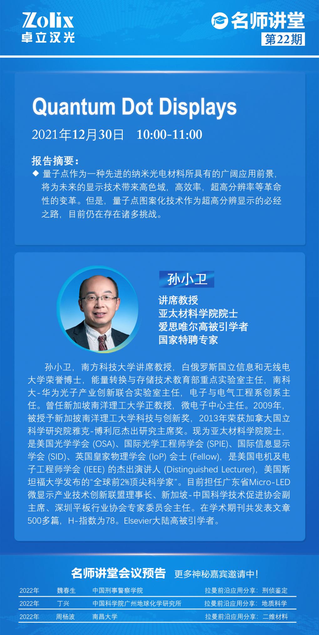孙小卫现为南方科技大学讲席教授,能量转换与存储技术教育部重点实验室主任,南科大-华为光子产业创新联合实验室主任,电子与电气工程系创系主任。曾任新加坡南洋理工大学正教授,微电子中心主任。2009年,被授予新加披南洋理工大学科技与创新奖,2013年荣获加拿大国立科学研究院雅克-博利厄杰出研究主席奖。现为亚太材料学院院士,是美国光学学会 (OSA)、国际光学工程师学会 (SPIE)、国际信息显示学会 (SID)、英国皇家物理学会 (loP) 会士 (Fellow),是美国电机及电子工程师学会 (IEEE) 的杰出演讲人 (Distinguished Lecturer),美国斯坦福大学发布的“全球前2%顶尖科学家”。目前担任广东省Micro-LED微显示产业技术创新联盟理事长、新加坡-中国科学技术促进协会副主席、深圳平板行业协会专家委员会主任。在学术期刊共发表文章500多篇,H-指数为77。Elsevier大陆高被引学者。