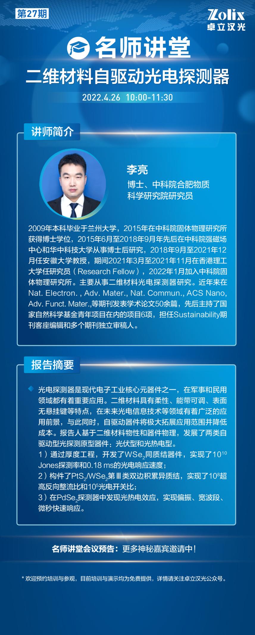 讲师简介:李亮,中科院合肥物质科学研究院研究员。2009年本科毕业于兰州大学,2015年在中科院固体物理研究所获得博士学位,2015年6月至2018年9月年先后在中科院强磁场中心和华中科技大学从事博士后研究,2018年9月至2021年12月任安徽大学教授,期间2021年3月至2021年11月在香港理工大学任研究员(Research Fellow),2022年1月加入中科院固体物理研究所。主要从事二维材料光电探测器研究。近年来在Nat. Electron. , Adv. Mater., Nat. Commun., ACS Nano, Adv. Funct. Mater.,等期刊发表学术论文50余篇,先后主持了国家自然科学基金青年项目在内的项目6项,担任Sustainability期刊客座编辑和多个期刊独立审稿人。