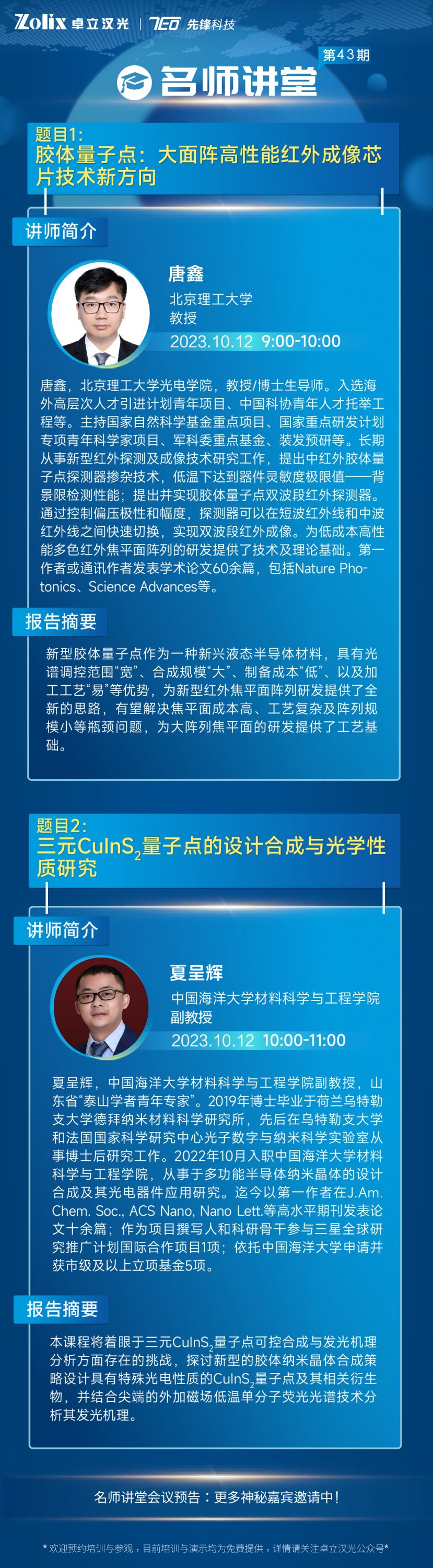 为了与大家共同感受诺贝尔化学奖-量子点的科技魅力,本期快盈lV特别隆重邀请到了北京理工大学—唐鑫教授和中国海洋大学材料科学与工程学院—夏呈辉副教授,与大家分享在胶体量子点研究领域的经验和心得体会,希望本次讲座能够为您的科学研究带来灵感与助力,推动研究的进展,精彩不容错过,赶快报名开启学习之旅吧~