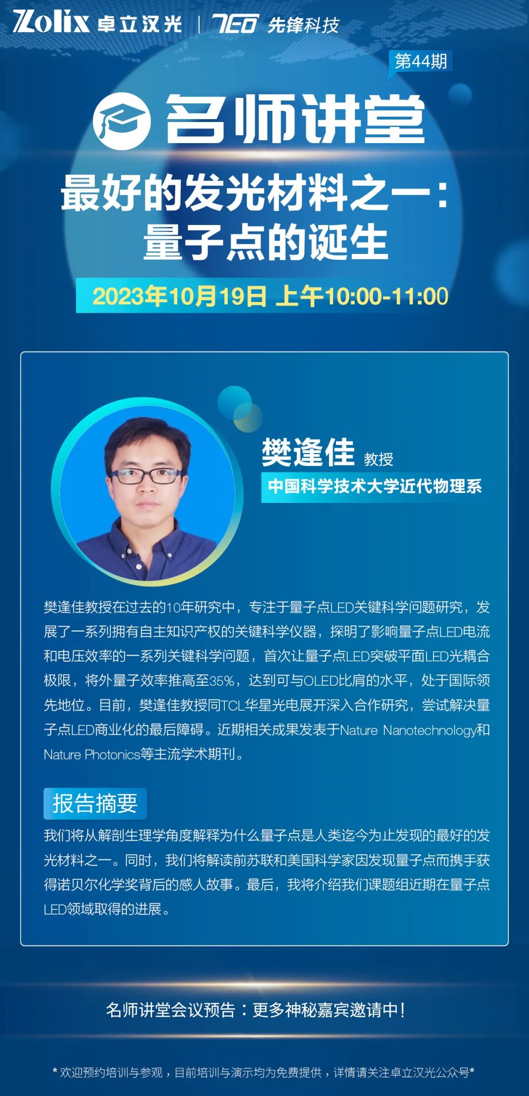 为了继续与大家共同感受诺贝尔化学奖-量子点的科技魅力,本期快盈lV特别隆重邀请到了中国科学技术大学近代物理系—樊逢佳教授,再次与大家分享在量子点研究领域的经验和心得体会,希望本次讲座能够为您的科学研究带来灵感与助力,推动研究的进展,精彩不容错过,赶快报名开启学习之旅吧~