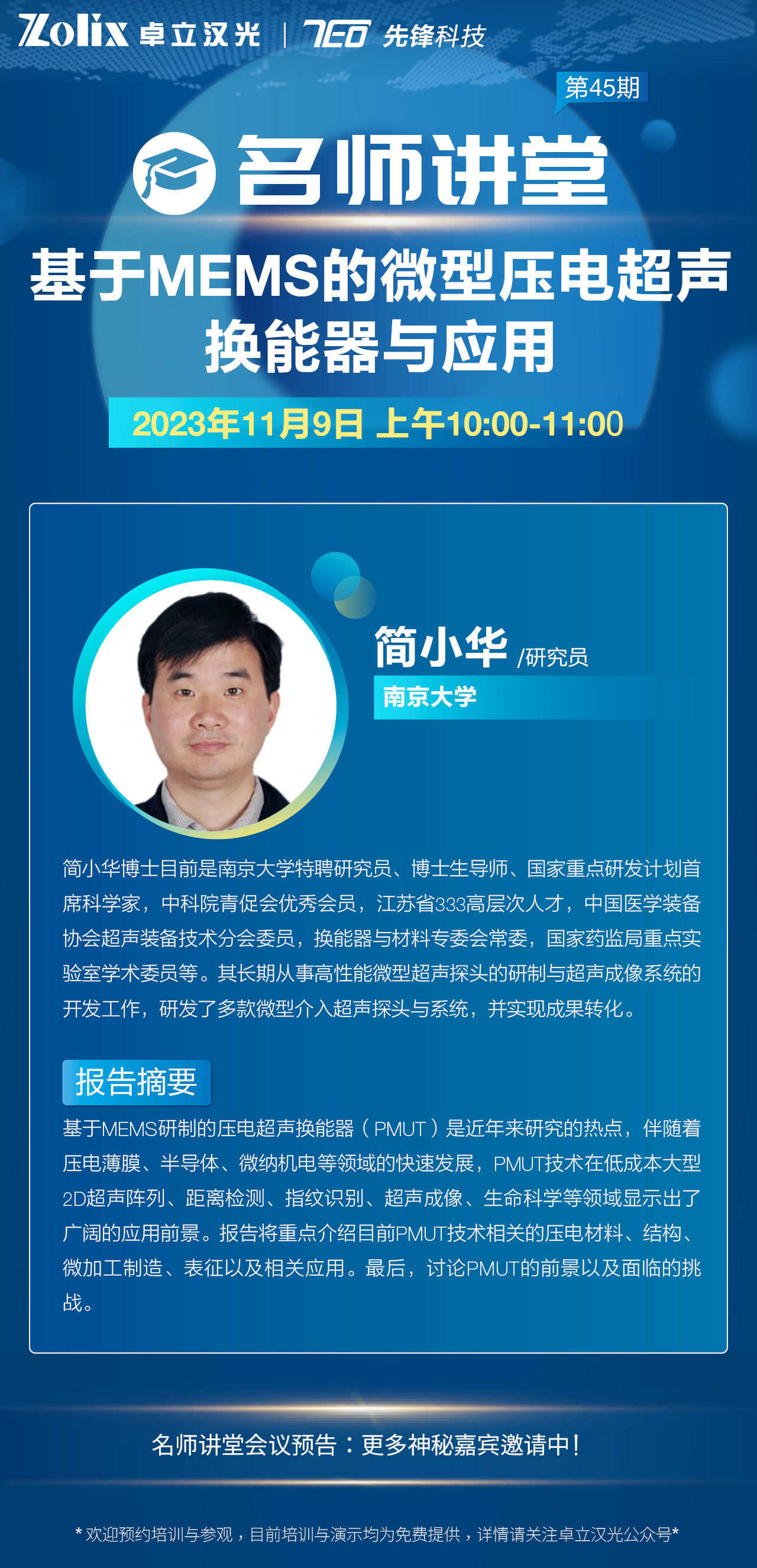 本期隆重邀请到了南京大学特聘研究员—简小华研究员,与大家分享自己科研领域的经验和心得体会,他带来的讲座题目是《基于MEMS的微型压电超声换能器与应用》,希望本次讲座能够为您的科学研究带来灵感与助力,推动研究的进展,精彩不容错过,赶快报名开启学习之旅吧~