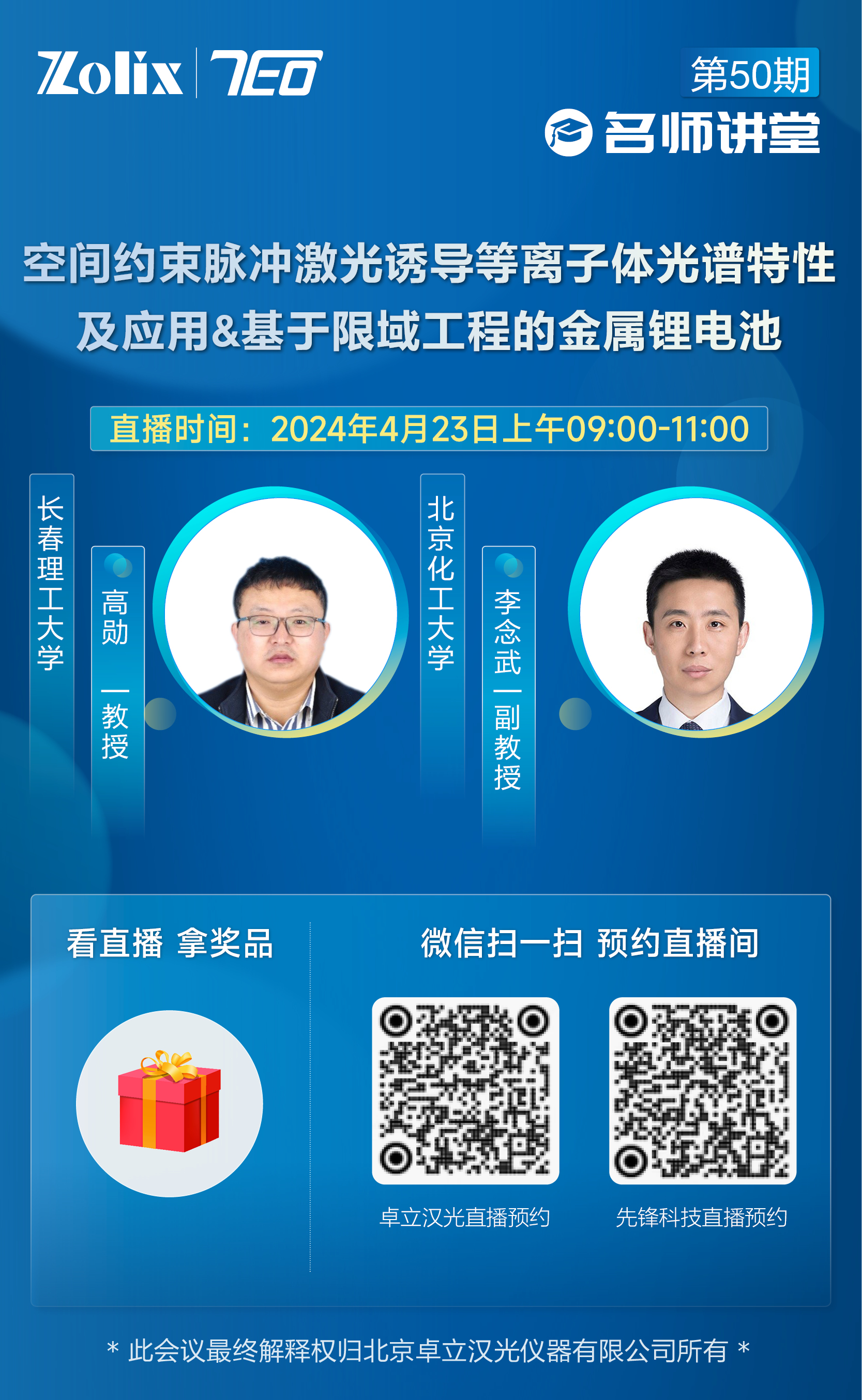 4月23日上午9:00—11:00,长春理工大学教授—高勋、北京化工大学副教授—李念武将分别为大家带来讲座《空间约束脉冲激光诱导等离子体光谱特性及应用》和《基于限域工程的金属锂电池》。直播期间更有丰富好礼相送,欢迎届时参加!