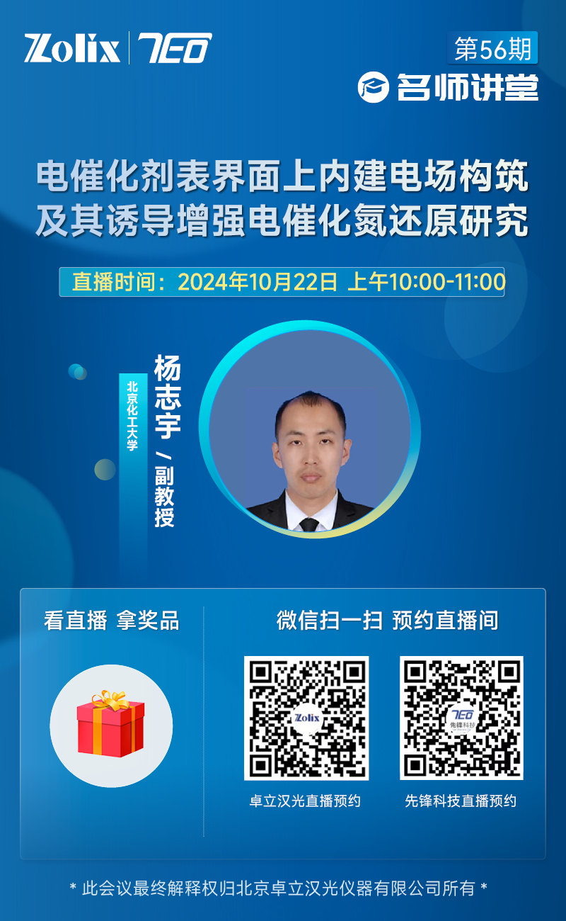 10月22日上午10:00—11:00,北京化工大学副教授——杨志宇,为大家带来讲座《电催化剂表界面上内建电场构筑及其诱导增强电催化氮还原研究》。直播期间更有丰富好礼相送,欢迎届时参加!