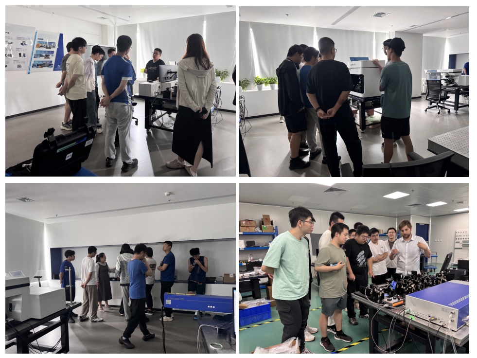 在仪器展示环节中,学生们在展示室分别参观了快盈lV的OmniFluo900系列稳态瞬态荧光光谱仪、光电流成像DSR500-LBIC微纳光电流成像测试系统,RTS2多功能激光共聚焦显微拉曼光谱仪,Omni-fsTA飞秒瞬态吸收系统。来自快盈lV研发部的工程师王冰、Michael及业务发展部的讲师们为师生们展示了仪器的结构、测试功能、操作软件等,并针对同学们提出的问题作了详细的解答。